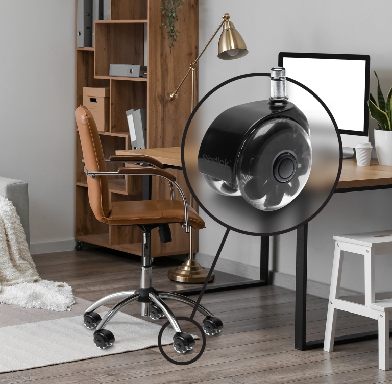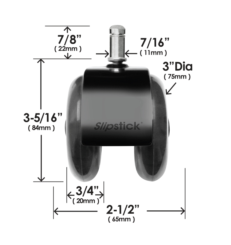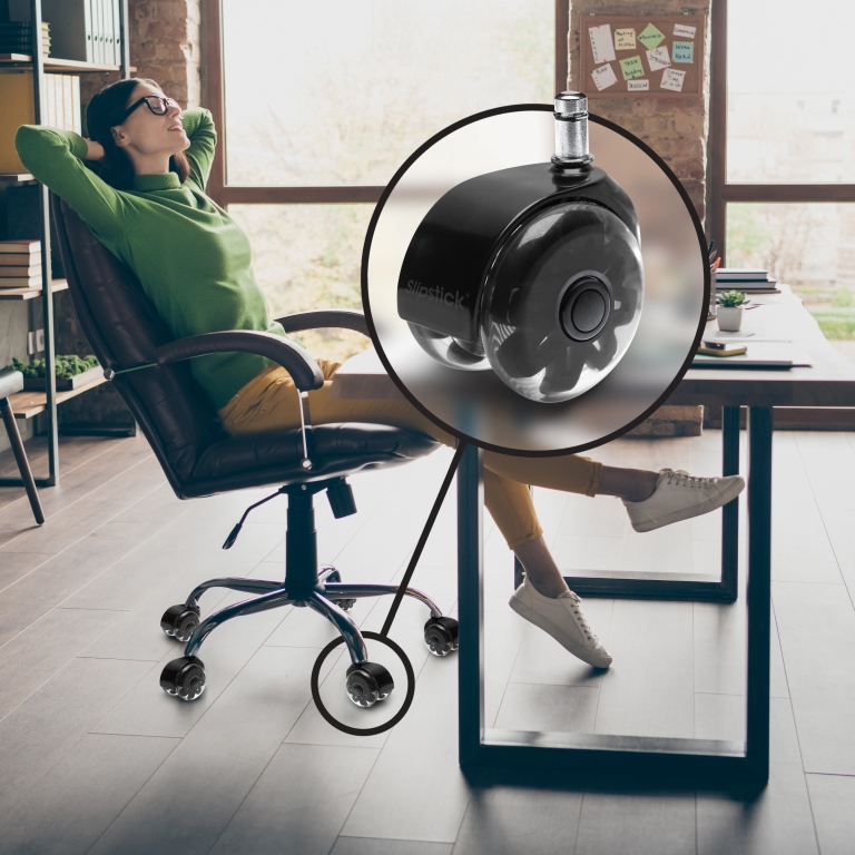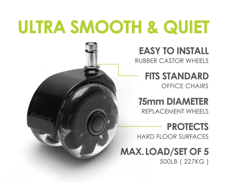 • Safe rolling on all hard surface flooring and low pile carpet (no chair mat needed) – Slipstick premium office chair castor wheels feature floor protecting twin 7.5 cm rubber rollerblade style wheels that will not scratch, damage, mark or smudge your flooring providing safe and smooth chair rolling over hardwood, vinyl, laminate, lvt, lvp, linoleum, parquet, tile, concrete, low pile carpet / rugs, and more.